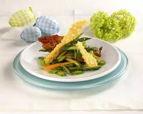 Wash the asparagus, cut off the woody ends generously, peel the carrots (leave some green if necessary) and wash them. Asparagus, up to the tips, cut into slices. Halve or quarter the tips and carrots lengthwise. Steam carrots in little boiling salted water covered for about 6 minutes. Add the asparagus after about 3 minutes. Drain, cool down