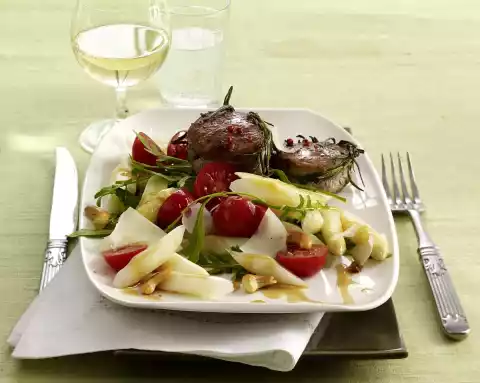 Wash the meat, dab dry. Wash the rosemary and pat dry. Tie 1 sprig of rosemary around each medallion using kitchen twine. Season meat with salt and pepper. Heat 2 tablespoons of oil in a pan and fry the meat on each side for about 4 minutes.
