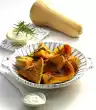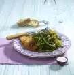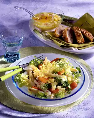 Wash the potatoes and cook in boiling salted water. In the meantime wash the frisée salad, pluck into bite-sized pieces and drain. Cut carrots diagonally into slices. Cook the asparagus in boiling salted water for 6-8 minutes. Then take them out and put them aside.