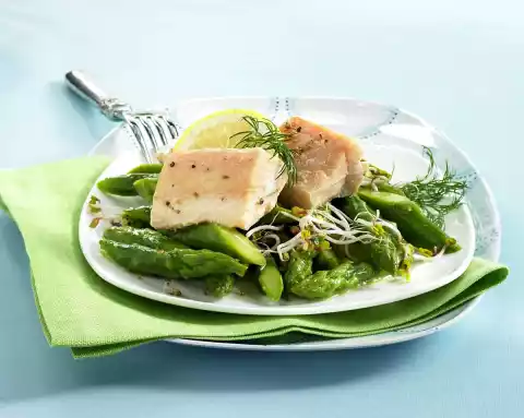 Cut asparagus diagonally into bite-sized pieces. Cook in salted water for 7-8 minutes. Meanwhile wash salmon, dab dry and cut into cubes. Season with salt and sprinkle with lemon juice. Bring fish stock to the boil in a wide pot. Add the salmon cubes and cook for about 10 minutes. Drain the asparagus and mix immediately with the vinaigrette. Wash the dill and shake dry. Pluck the flags from the stalks, except for a few for garnishing, and chop finely.