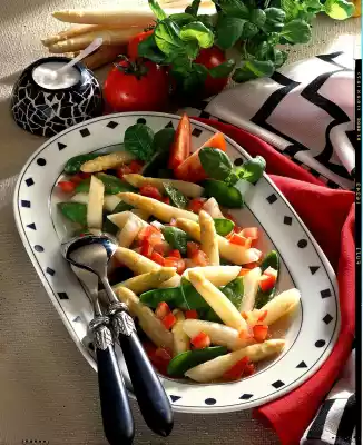 Wash the tomatoes, remove the stalk, quarter the tomatoes and, except for 2 quarters for garnishing, cut into cubes. Turn the diced tomatoes, sugar peas and asparagus in the salad dressing and allow to soak through a little.