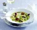 Heat the cream and asparagus in it. Season to taste with salt, pepper, lemon and nutmeg. Serve with ham, chervil, croutons