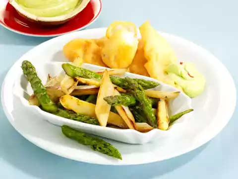 Rinse the asparagus under cold water. Separate the eggs. Stir egg yolk, wine and flour until smooth and let rest for about 15 minutes. Wash the fish, dab dry and cut into pieces. Sprinkle fish with lemon and season with salt.