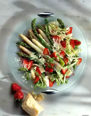 Wash, clean and slice the strawberries. Mix vinegar, salt and pepper. Whip the oil into it. Mix asparagus, cabbage and strawberries. Pour over the marinade and let it stand for about 30 minutes.