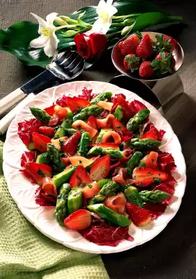Wash the asparagus, cut off the lower woody end. Cook the asparagus in boiling salted water for 5 minutes, take them out, let them cool down and cut them diagonally into approx. 4 cm long pieces. Wash strawberries, drain on a sieve, clean and slice. Clean, wash and pluck the radicchio into bite-sized pieces. Cut salmon ham into wide strips. Wash parsley, dab dry and chop finely. Mix vinegar, salt and pepper. Whip the oil into the mixture. Stir in parsley. Arrange asparagus, strawberries, salad and strips of smoked ham on a plate. Spread the marinade over it and serve with the toast