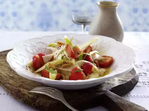 Mix asparagus, strawberries, pine nuts, basil and dressing. Arrange in plates.