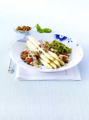 Add the meat mix and 2/3 chopped basil to the sauce and season with salt and pepper. Remove the asparagus from the water. Arrange the asparagus and pasta. Pour chicken ragout over the asparagus. Sprinkle with remaining basil and pine nuts.