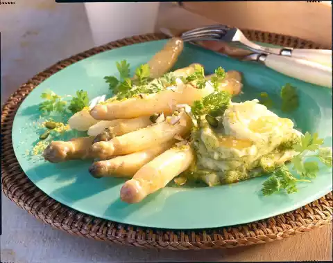 Wash and peel the asparagus and cut off the woody ends. Cook the asparagus in boiling salted water with some sugar and a slice of lemon at medium heat for about 20 minutes. In the meantime, wash and finely chop the chervil and parsley. Bring 3/8 litres of water and 1/2 teaspoon salt to the boil. Remove the pot from the heat. Add milk and herbs. Stir in puree flakes.