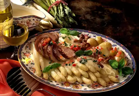 Deglaze with 1/4 l asparagus stock, remaining cream and reduced wine. Bring to the boil, pour through a sieve and alloy with whisked egg. Do not boil any more. Season with salt, pepper and sugar.