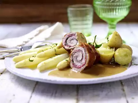 Lift out the asparagus and let it drip off. Drain the potatoes. Arrange roulades with asparagus, potatoes and sauce. Sprinkle with the rest of the parsley.