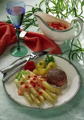 Cook potatoes in little boiling salted water for about 20 minutes, asparagus for about 10 minutes. For the tomato and hollandaise sauce, heat butter in a pot and skim. Put the egg yolk and white wine in a metal bowl and place on a hot water bath.