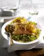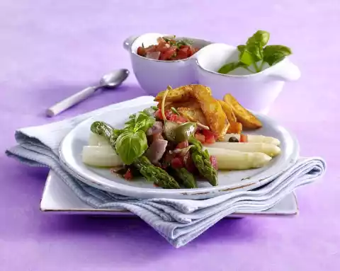 Pluck the remaining basil from the stalks, chop leaves finely and fold into the salsa. Remove the asparagus, drain briefly and arrange on plates with potato wedges and salsa. Garnish with halved caper apples and basil.