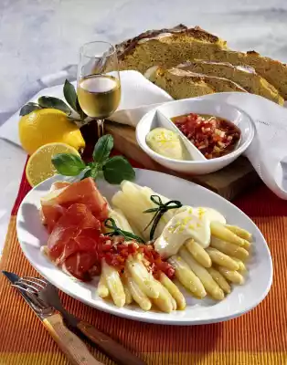 Lift out the asparagus and drain well. Cool down a little or let it cool down completely. Wash the chives and dip them briefly in the hot asparagus water. Divide the asparagus into 8 portions. Tie each portion together with chives. Arrange everything. Sprinkle mayonnaise with the remaining lemon peel. Serrano ham in thin slices and fresh country bread taste good with it.