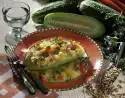 Cover with a sage leaf or some rosemary and wrap in two slices of courgette or one slice of aubergine. Fix the rolls with a wooden skewer. Heat 2-3 tablespoons of oil in a pan and fry the rolls in 2 portions until golden brown, turning them over. Add another 1-2 tablespoons of oil to the 2nd portion. Season with pepper and arrange on a plate. Serve hot or cold with the yoghurt dip and flat bread