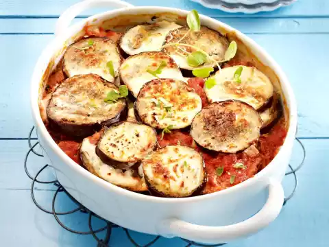 Grease a baking dish with oil and fill it successively with 1/3 each of tomato sauce, aubergines and ricotta cream. Repeat until the ingredients are used up. Sprinkle with the remaining Parmesan cheese. Bake in a hot oven at the same temperature for about 30 minutes. Garnish with oregano