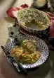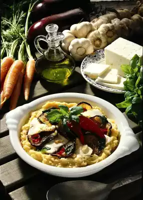 Sprinkle chilli rings, garlic and basil leaves over the casserole. Garnish with 2 chilli peppers. Push the casserole briefly under the grill until the sheep's cheese begins to brown slightly. Serve garnished with basil bouquets.
