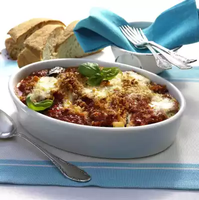 Sprinkle with some Parmesan cheese and cover with about 1/3 of the mozzarella slices. Spread 1/3 of the aubergine slices on top. Layer until all ingredients are used up. Finish with minced sauce, parmesan and mozzarella. Sprinkle breadcrumbs on the casserole. Bake in the preheated oven (electric oven: 200 °C/recirculating air: 175 °C/ gas: level 3) for 35-40 minutes on the bottom shelf. Garnish with oregano put aside. Ciabatta bread tastes good with it