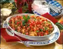 Clean and wash the aubergines and cut them into slices about 1/2 cm thick. Sprinkle a large tray or board with salt. Spread aubergines on top and also sprinkle with salt. Leave to stand for about 1 hour. (The salt removes the water from the aubergines so that they do not become too soaked with fat when frying). Lightly carve tomatoes crosswise. Scald with boiling water, take out and rinse cold. Peel skin, remove seeds and dice tomatoes. Wash the oregano, dab dry, put something aside for garnishing.