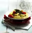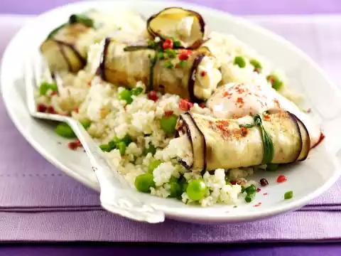 Add the peas to the millet about 10 minutes before the end of cooking time. Pour off excess water from the millet. Arrange aubergine rolls on top of the millet and garnish with remaining chives and pink pepper berries.