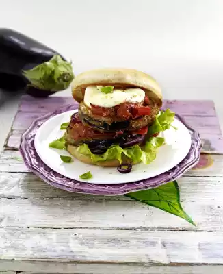Cover the undersides of the rolls with salad, red onion rings and slices of aubergine au gratin. Put the tops of the rolls on. Garnish with basil leaves and serve immediately.