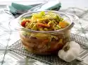 Peel onions and garlic. Cut onions into rings. Chop garlic finely. Wash the salad and shake dry. Wash, clean and chop the tomatoes. Wash basil, dab dry and chop finely except for a few leaves for garnishing.