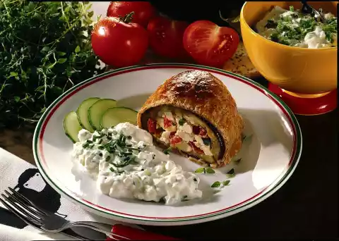 Mix with quark and yoghurt. Wash the cucumber and dice finely, except for one piece. Stir in and season. Arrange aubergines and quark. Garnish with cucumber slices.