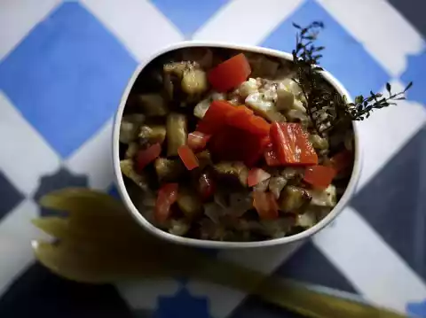 Drain the peppers. Wash and quarter the tomatoes. Cut both into small cubes and fold into the eggplant cubes. Goes well with flat bread.