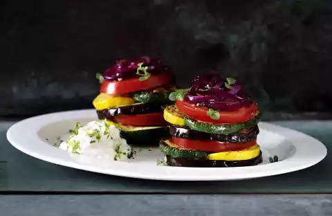 Clean and wash the zucchini and eggplants. Cut the courgettes into thin slices. Wash and clean the tomatoes. Cut aubergines and tomatoes into approx. 1 cm thick slices. Peel onions and cut into thin rings.