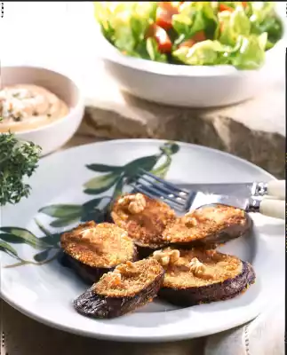 Dab aubergine slices dry, season with pepper and spread a thin layer of quark on top. Turn in the walnut pancake. Clean, wash and drain the salad. Pluck into bite-sized pieces. Wash, clean and quarter the tomatoes.