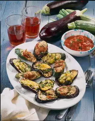 Sprinkle breadcrumbs over the bacon. Put the aubergine and courgette slices on a baking tray and bake in the preheated oven (electric cooker: 225 ° C/ gas: level 4) for about 5 minutes. In the meantime, peel garlic, chop finely and add to the chunky tomatoes. Season with salt and pepper. Wash parsley, dab dry and chop finely. Arrange the gratinated eggplant and courgette slices on a plate and sprinkle with the chopped parsley. Serve sauce extra