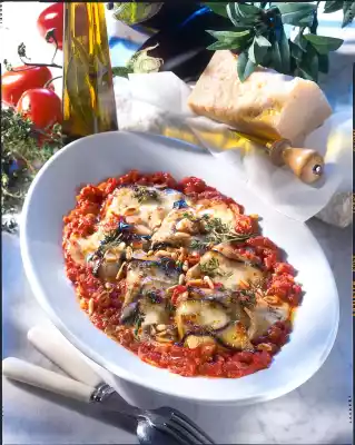 Season tomato sauce to taste and pour into a flat ovenproof dish. Place aubergine parcels on top. Cut the mozzarella into slices and place on top. Bake in the preheated oven (electric cooker: 225 °C/circulating air: 220 °C/gas: level 4) for approx. 10 minutes