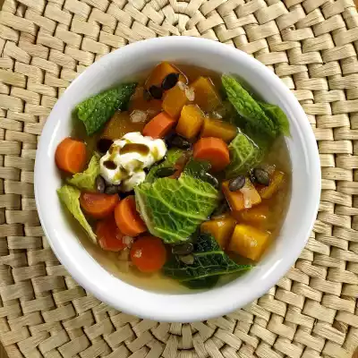 Heat oil in a pot and fry shallots until translucent. Steam carrots and cabbage briefly and deglaze with broth. Cover and cook soup at medium heat for 18-20 minutes. In the meantime, roast pumpkin seeds in a pan without fat, remove.