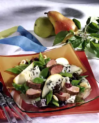 Cut the cheese into fine pieces. Cut meat into slices. Arrange salad leaves, beans, meat and pear wedges carefully mixed together. Spread almonds and cranberries on top. Serve drizzled with the warm marinade.