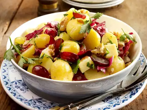 Cut the cheese into cubes. Clean, wash and roughly pluck the radicchio into pieces. Add nuts, grapes, chopped parsley, cheese and radicchio to the salad before serving, then season to taste again. Garnish with parsley