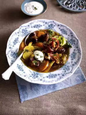 Wash parsley, shake dry and chop finely. Coarsely crumble the bacon and mix with the parsley. Sprinkle the stew with it and serve. A dash of crème fraîche is delicious with it.