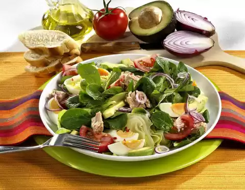 Cut the avocado quarter into slices and sprinkle with 1 tablespoon lime juice. Peel onion and slice thinly. Mix tuna, lamb's lettuce, iceberg lettuce, eggs, tomatoes, avocado and onion.