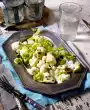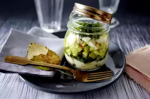 Layer mozzarella, basil and avocado mix alternately in four glasses (250 ml each).