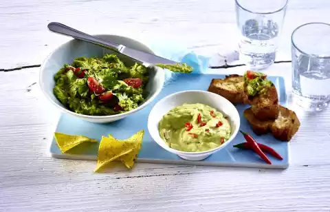 Mix the coriander and tomatoes with the avocado pulp, except for a little bit for garnishing. Season guacamole with lime juice, salt and pepper. Arrange dips in small bowls. Sprinkle aioli with chilli, garnish guacamole with coriander and tomatoes.