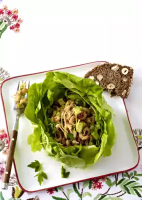 Wash and chop the parsley. Halve the avocado. Remove the core, remove the flesh and dice. Mix both with lettuce strips, shrimps and sauce and fill into the lettuce heads. Nut bread tastes good with it.