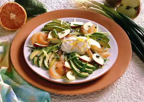 Halve the avocado. Remove seeds and peel the fruit halves. Cut the fruit flesh into thin slices. Wash and quarter apples. Remove the seeds. Cut apples into pieces. Peel grapefruit thickly so that the white skin is completely removed. Use a knife to remove the fillets from the parting skins. Clean and wash spring onions and cut them into pieces. Chop pumpkin seeds. Mix yoghurt, crème fraîche, grated lemon peel, lemon juice and honey. Season with salt and pepper. Spread the salad ingredients on 4 plates. Sprinkle with chopped pumpkin seeds. Pour sauce over them. Garnish with grated lemon
