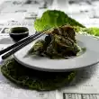 Arrange lettuce strips, tomato cubes and avocado pieces and sprinkle with the marinade. Finally sprinkle the bacon over it