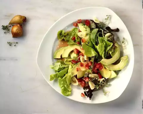 Peel shallots and cut into thin rings. Cut cress leaves from the stems. Mix oil and vinegar. Add tomato cubes and shallots, season with salt and pepper. Mix salad, avocado and tomato vinaigrette