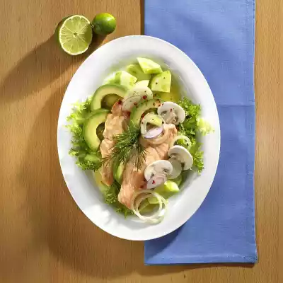 Lift the flesh out of the skin, cut into slices and sprinkle with the lime juice. Peel the cucumber, cut it into eighths lengthwise and cut it into small pieces. Peel onion and cut into thin rings. Carefully mix the salads together. For the dressing, mix the red wine with the vinegar, oil, mustard, pepper, salt and honey, mix the salad with it and let it stand for a short time. Take the salmon out of the foil, cut it into pieces, spread on the salad and garnish with dill