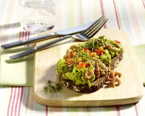 Clean, wash and cut the peppers into small cubes. Remove the avocado flesh from the skin, crush it coarsely with a fork and add lemon juice. Season with salt and pepper. Fold in crabs and 15 g paprika and spread on the bread.