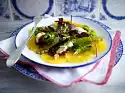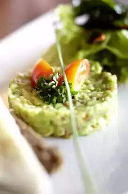 Approx. 1⁄4 Fill the avocadotatar into an appetizer ring (approx. 8 cm Ø; alternatively fold rings of aluminium foil) for serving. Remove the ring carefully. Arrange 3 more tartar tarts from the rest of the tartar.