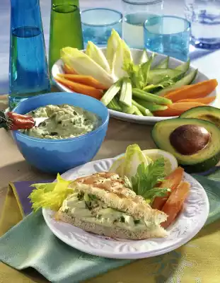 Spread the flat bread with avocado tzatziki. Serve with vegetables and the remaining dip. Garnish with celery green and possibly lemon