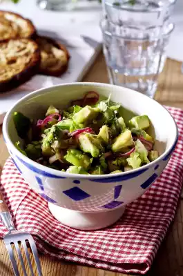 Clean, wash and shake the salad dry and cut into short strips. Wash coriander, shake dry, cut leaves from the stems and chop coarsely. Halve the avocado, remove the core, remove the flesh from the peel and dice the flesh.