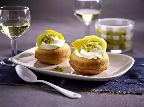 Peel the kiwis, halve them lengthwise and cut into slices. Cut the mango from the stone. Peel the flesh and cut into slices. Halve the passion fruit and remove the pulp with a spoon