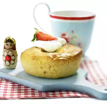 Warm the milk lukewarm. Pour the flour into a bowl and make a depression in the middle. Crumble yeast into it. Pour milk into the yeast and mix with some flour. Cover the dough and let it rise in a warm place for about 15 minutes. Melt the fat and let it cool down a little. Stir eggs, 50 g sugar and salt until creamy. Add liquid fat. Pour into the yeast pre-dough and mix everything to a smooth, almost liquid dough. Cover and leave to rise for another 30 minutes. Grease 8 savarin cups (approx. 10 cm Ø). Fill half of each mould with the dough and leave to rise for another 20 minutes. Bake in the preheated oven (electric cooker: 200 °C/ convection oven: 175 °C/ gas: level 3) for about 20 minutes. Gently heat up rum, 4 tablespoons of sugar, 1 packet of vanilla sugar and orange juice until the sugar has dissolved. Put babas on a cake rack, prick them several times with a wooden stick and soak them with the rum mixture. Let it cool down. Mix crème fraîche with 1 sachet of vanilla sugar. Dust the babas with icing sugar and decorate with crème fraîche and strawberries
