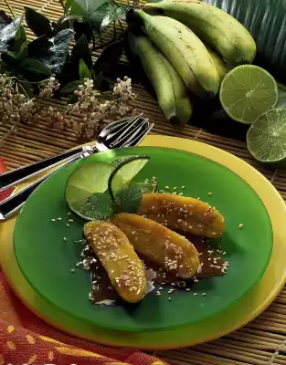Take out and let the honey-lime sauce boil down a little. Arrange three banana halves in portions, drizzle with honey sauce and sprinkle with sesame seeds. Decorate as you like with lime wheels and lemon balm.